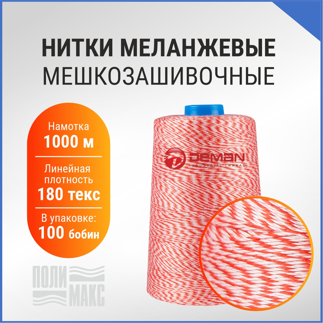 В компании «Полимакс» представлены бело-красные мешкозашивочные нити из 100% полиэстера. Ими фиксируют горловины мешков для защиты содержимого от влаги, мусора, просыпания во время транспортировки.