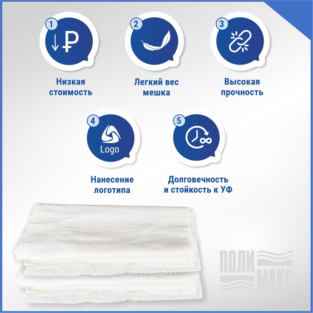 Компания «Полимакс» предлагает белые мешки из первичного полиэтилена размером 50×90 см и вместимостью до 40 кг. Плотное плетение обеспечит сохранность содержимого. Ткань воздухопроницаема, поэтому пищевая продукция сохраняет свое качество. Посторонний запах отсутствует.
